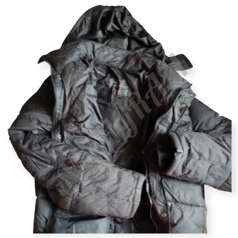 Три кармана на кнопках, два внутри. Застёжка на молнию и кнопки, капюшон отстёгивается, на молнии. Фирменная фурнитура, пухлый, непромокаемый и не продуваемый, очень теплый.