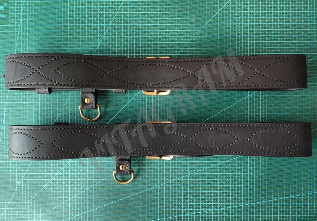 Ориентиром при изготовлении ремня был советский офицерский ремень 3 размера. Общая длина ремня одинакова, но для гармоничного расположения офицерской прошивки на полотне ремня, пришлось сместить отверстия для застегивания на 2-3 пары в сторону пряжки.
