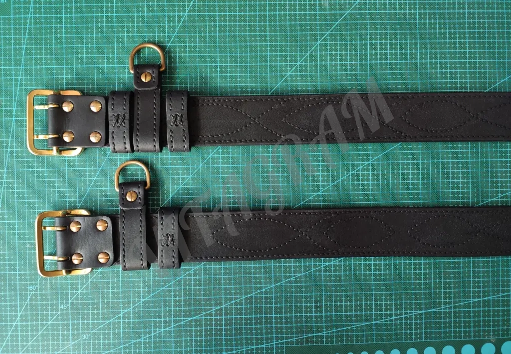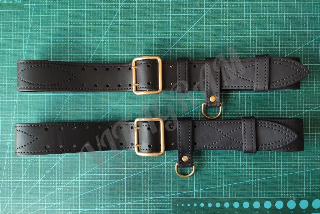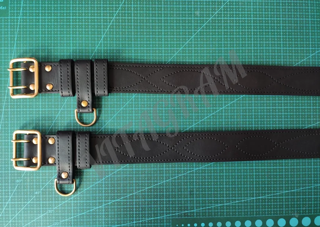Ремень полностью прошит вручную седельным швом толстой 1 мм нитью, в том числе и офицерская прошивка. Прошивка седельным швом дополнительно укрепляет и армирует ремень. Кожа прожирована костным маслом и ланолином, а также жировосковым защитным составом.