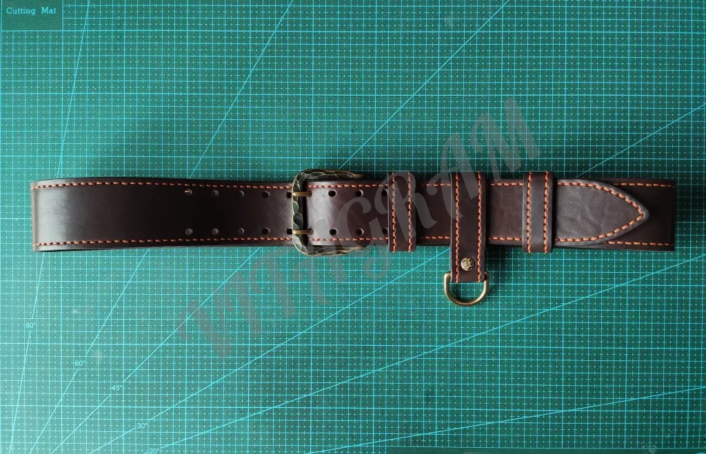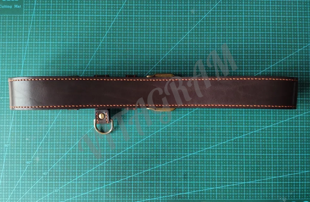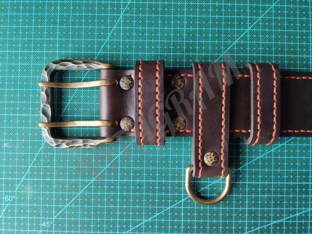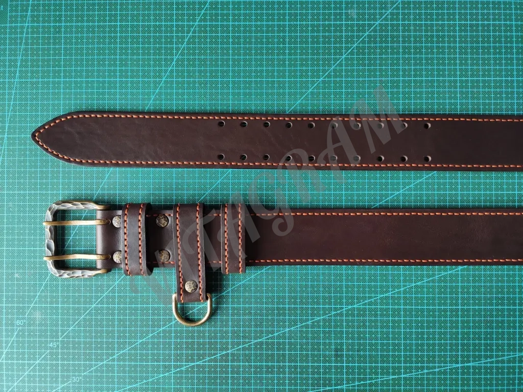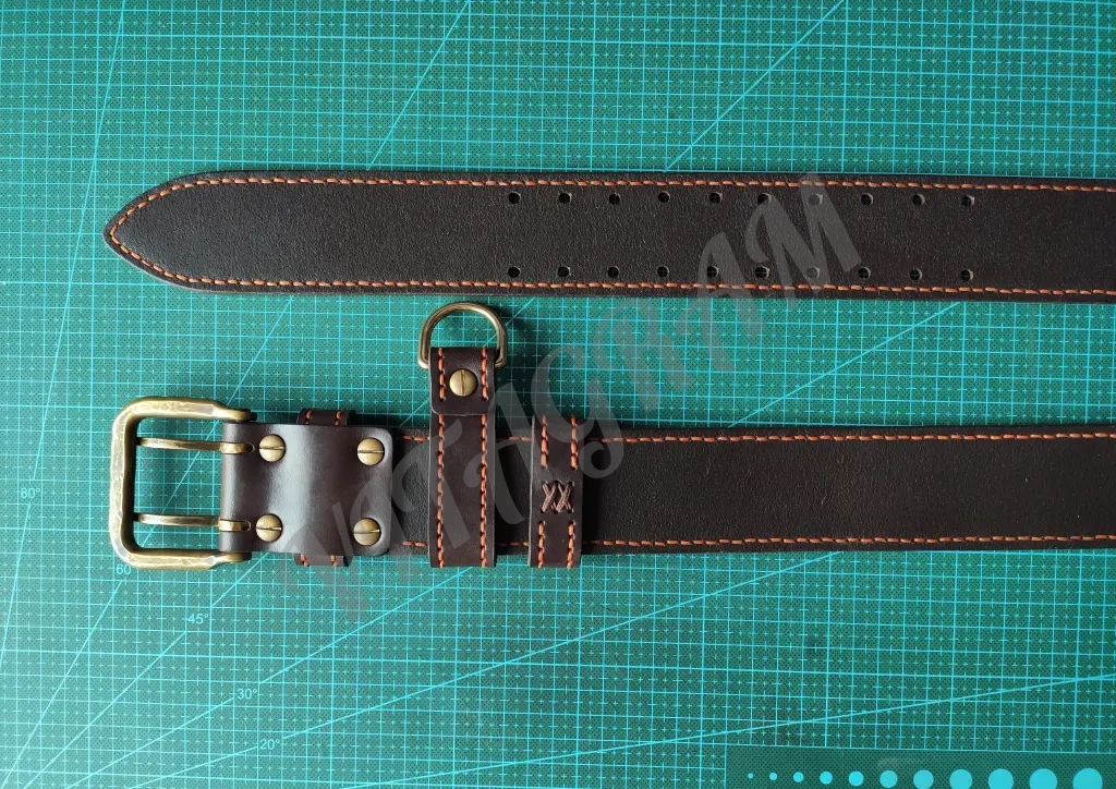 Ремень полностью прошит вручную седельным швом толстой 1 мм нитью. Нить CT Poin 1 мм «Мандарин» («Mandarino»), одна из лучших ниток, которые доступны на рынке. Нить не плоская, не расплющивается как китайская, условно имеет форму овала, вощеная, плетеная.