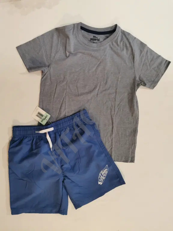 Комплект новой одежды для мальчика ростом 146-152 см от бренда Peppers ( футболка) и шорты (Teens & tens.) все Германия. Футболка серо- голубого цвета бирка оторвана . Шорты синие, с фирменным логотипом. ( можно купаться) бирка присутствует . смотрите обзор на видео