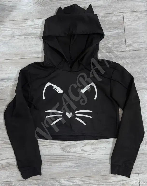 Укороченная толстовка, без утеплителя, с капюшоном с ушками, с длинным рукавом. Размер 42-44. Состояние нового.