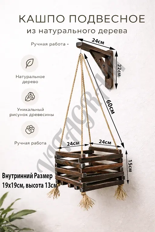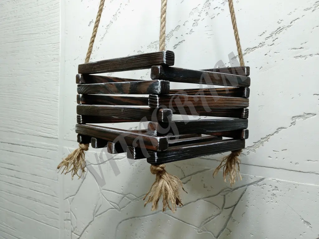 Стильное подвесное кашпо ручной работы станет выразительным акцентом в интерьере или на террасе. Изделие выполнено из массива сосны с применением техники глубокого обжига и браширования, что подчёркивает естественную текстуру древесины и придаёт поверхности благородный рельеф.