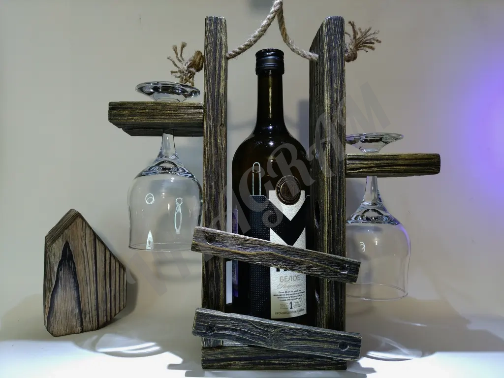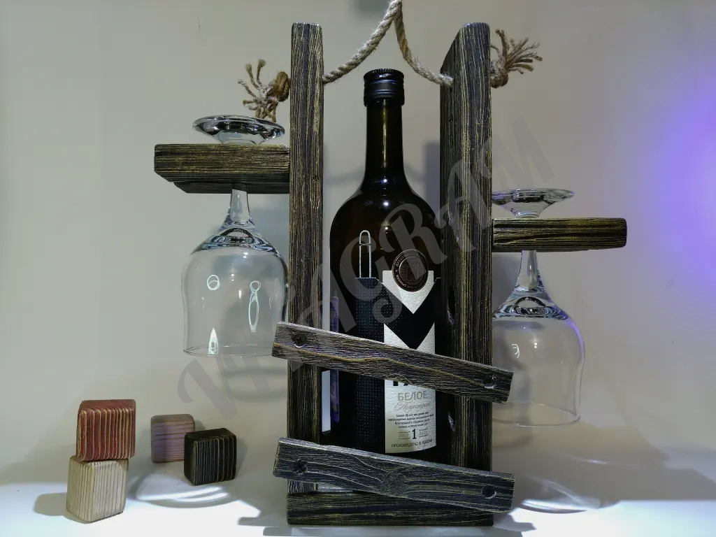 Подставка из дерева, ручная работа. Брашированная поверхность для бокалов и вина. Идеально для использования в кухонном интерьере или мини-ресторане загородного дома. Удобная, практичная. Золотая патина с прозрачным слоем лака краски.